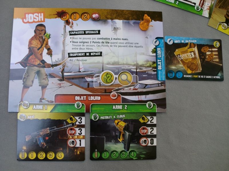 Votre but sera le plus souvent d'aller d'un point A vers un point B, et de réaliser certains objectifs en cours de route. Avant de débuter une partie, les joueurs choisissent leurs personnages, chacun disposant de pouvoirs spécifiques, que ce soit à propos des points de vie, de la capacité de charge, de combat, ou de déplacement. Tout ceci étant résumé sur la fiche de personnage. En haut se trouve le nom du personnage, à côté ses points de vie (3 sur la fiche de Josh) sur lesquels on pose un jeton cœur, en dessous les capacités spéciales, puis encore en dessous l'équipement de départ (Arc et Revolver sur l'exemple) qui diffère un peu selon les personnages. Ces équipements seront placés sur les deux emplacements en dessous, qui permettent de porter 2 objets à une main ou 1 objet à une main + 1 objet à deux mains. En dessous un emplacement pour poser un objet lourd. Enfin à droite on peut ajouter un objet léger gagné au fil des scénarios et qui représentent différents bonus, plus ou moins puissants selon leurs niveaux indiqués en haut de la carte (2 sur la photo exemple). On remarquera au passage la qualité des illustrations et la clarté des textes. Chaque joueur disposant de 4 actions par tour.