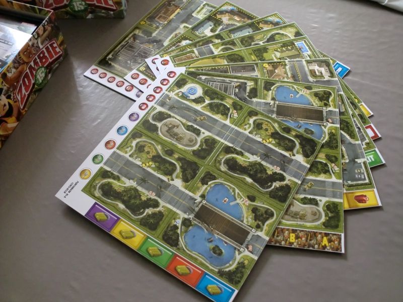 On place ensuite les tuiles qui vont composer le terrain de jeu. Pour cela on se réfère au livret de scénarios. Chaque tuile dispose de 2 faces : A et B, et d'un chiffre. On va donc suivre ces indications pour créer la zone. Les marquages sont assez discrets, peut-être un peu petits, mais rien de bien insurmontable. Par contre, c'est ici que l'on va rencontrer pour moi le plus gros défaut du jeu, j'ose même dire le seul : la mise en place. Celle-ci peut être un peu longue par rapport à la durée d'une partie. Ce que je vous conseille donc c'est de jouer plusieurs parties d'affilée afin d'optimiser toute cette phase et profiter au mieux de Zombie 15'.