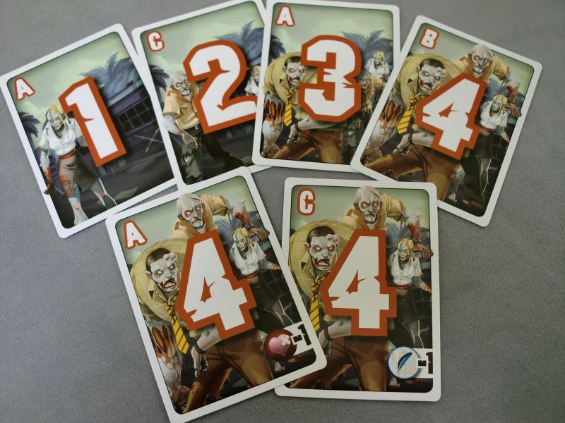 - la rapide, où 3 cartes sont piochées : on ajoute le nombre de zombies indiqué par la ou les cartes tirées, directement sur le plateau de jeu, on récupère les objets qui nous intéressent, et enfin on défausse les cartes restantes (zombies compris) ;