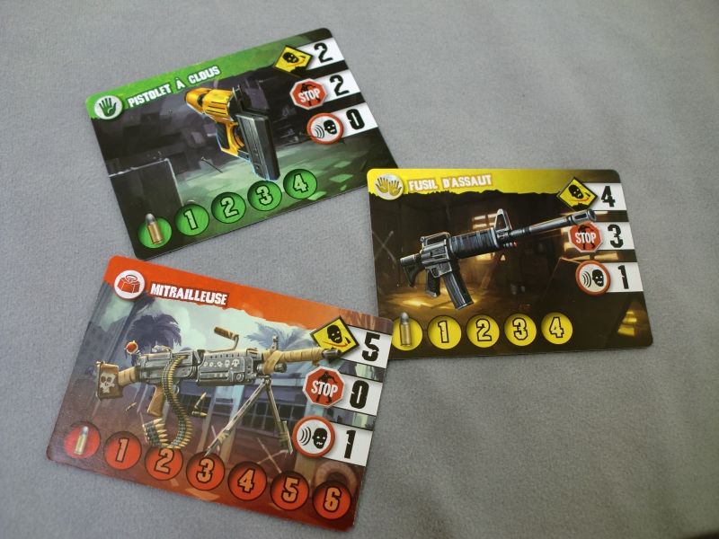 Les cartes équipements sont de différentes natures, et disposent de leurs propres caractéristiques. Elles sont de 4 sortes, arme à 1 main, arme à 2 mains, objet lourd et objet léger. En haut est indiqué le nom de la carte, sa nature et son poids, puis à droite ses caractéristiques, le panneau avec la tête indique le nombre de zombies que votre arme peut tuer en une fois, en dessous le panneau stop indique le nombre de zombies que vous pourrez repousser sans prendre de dégât si jamais vous vous trouvez avec eux à la fin de votre tour de jeu. Enfin en dessous si l'arme fait du bruit ou non, si c'est le cas il faudra ajouter un zombie dans la boite horde par chiffre. Puis tout en bas on trouve le nombre de fois où vous pourrez utiliser vos armes avant que celle-ci ne soit plus en état de vous défendre. Les objets légers possèdent un texte explicatif, puis une jauge d'usure, qui n'excède que très rarement l'usage unique. Quant aux objets lourds, une mitrailleuse, une caisse de munitions ou un jerrican, leurs effets sont dévastateurs, mais leur gestion est aussi plus complexe.