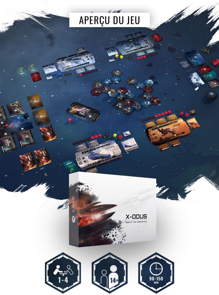 Il s’agit d’une campagne pour X-ODUS - Rise of the Corruption. Un jeu dans le thème de la science-fiction, avec des vaisseaux qui parcourent l’espace, mais aussi un jeu coopératif pour 1 à 4 joueurs. Deux choses que j’apprécie beaucoup et qui ont tendance à m'attirer :)