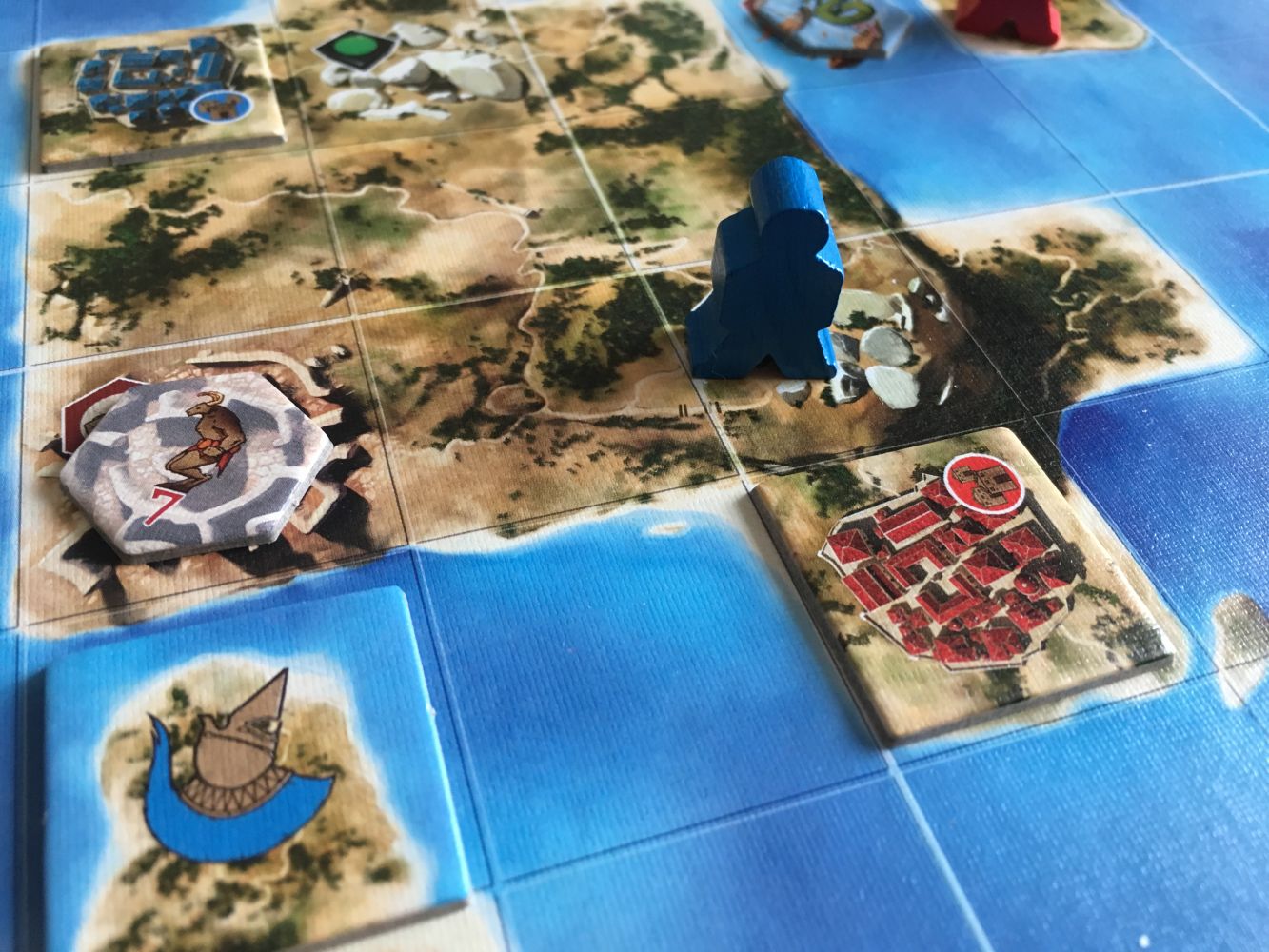 On n’a pas vraiment vu non plus l’intérêt des combats entre joueurs, à part gagner deux points… Mais, il y a plein d’autres façons de gagner des points. Oui, on peut renvoyer un adversaire ailleurs sur la carte, mais ça n’a jamais été indispensable pour nous. Reste les combats avec les créatures mythologiques, qui sont loin d’être évident (vu qu’il faut faire un 7 ou plus avec un dé 6, il est donc indispensable d’avoir des bonus).