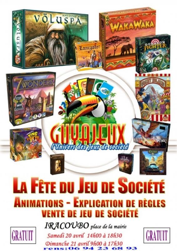 Le rendez-vous pour la fête du jeu de société est pris pour ce qui est de la Guyane : ça se passe à Iracoubo, ce week-end même, à savoir le samedi 20 et le dimanche 21 avril 2013 avec Guyajeux.
