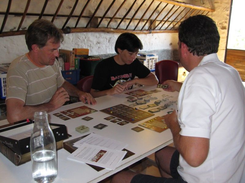 Il s'agit de Toulouse, Jonathan et Sylvain qui jouent une nième partie de RFTG.