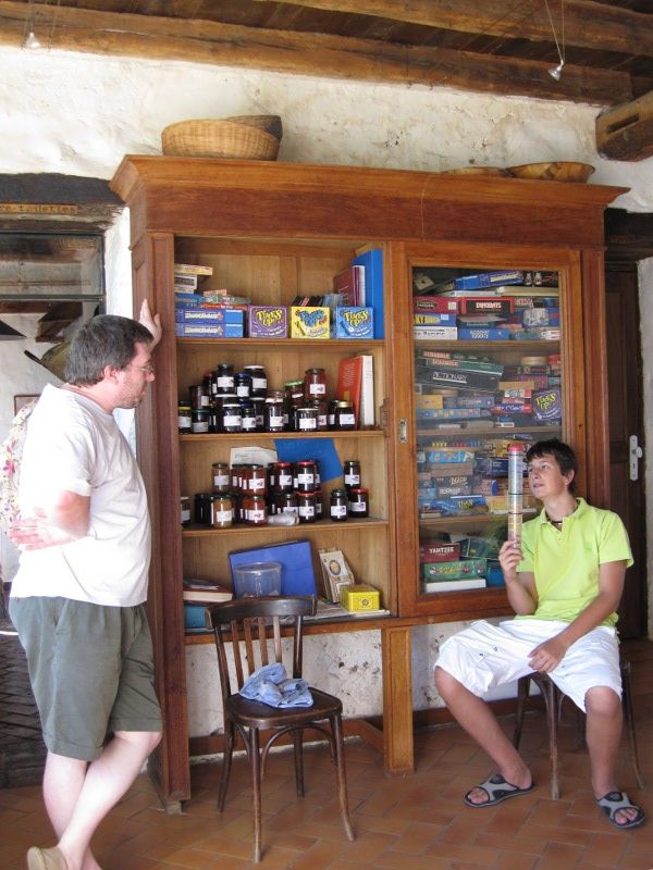 Gérald et Sylvain devant l'armoire à jeux et à confitures de la Fontaine aux Loups.