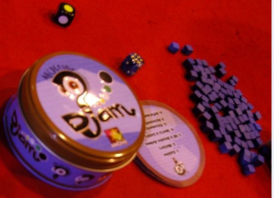 Djam, l'autre jeu au format, complétait la triptyque (débutée par Dobble) des boites de jeux en métal, rondes et commençant par la lettre D.