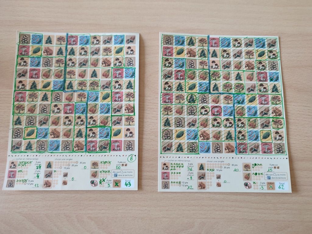 Ce qui plait tout de suite quand on découvre les fiches, ce sont les superbes illustrations des éléments des différentes saisons. Bravo à Eli Jäger car son travail donne tout son sens au jeu : la plupart des joueurs ressentent un côté tranquille ou zen pendant les parties. On a tout de suite le sentiment qu'on ne va pas trop pour une fois se prendre la tête ! (tu fais une zone, tu choisis quel élément tu veux scorer et on enchaine ).