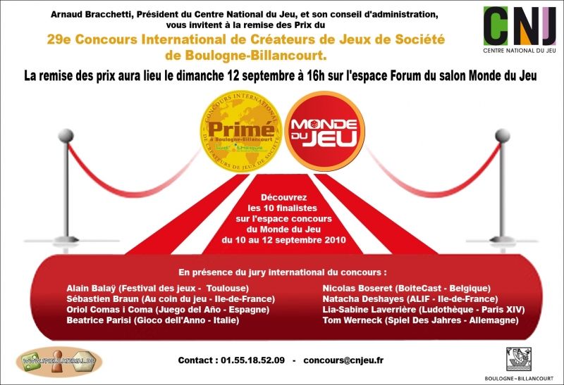 Les 10, 11 et 12 septembre 2010 le Centre National du Jeu accueillera les 10 finalistes du 29e Concours International de Créateurs de Jeux de Société de Boulogne-Billancourt sur l'espace dédié du Monde du Jeu (salon de jeux à Paris).