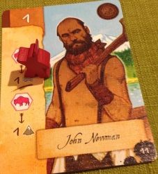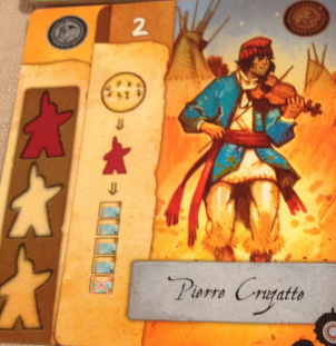 - Le chef d'expédition : Ce personnage permet d'avancer son explorateur de 2 cases rivière par nourriture, de 4 cases par canoé et de 2 cases montagnes par cheval. Elle est importante car mixe Rivière/Montagne et ne doit être écartée de votre jeu que si vous avez de quoi avancer sur les deux terrains en échange.