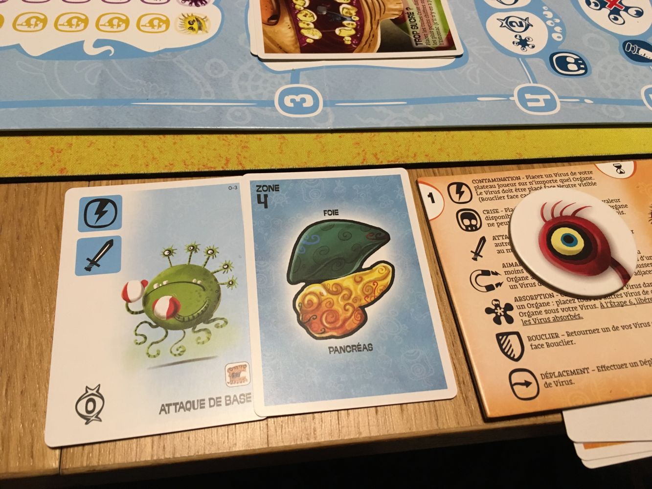 La carte zone va définir où certaines de vos actions vont se produire et la carte mutation va définir quelle(s) actions(s) vous allez faire : donner un bouclier à un de vos virus, déplacer un de vos virus par le système sanguin, placer un virus sur un organe, retirer le virus d’un autre joueur dans un organe où vous êtes présent, attirer un virus ou encore absorber tous les virus présent sur votre organe.