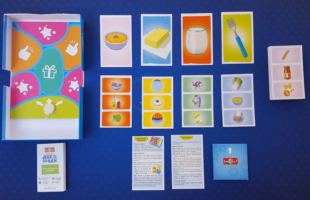 A l’ouverture de la boite (11,5 X 15,5cm) on trouve : 40 énigmes illustrées, 1 règle du jeu, 1 cache-carte, 1 plateau de jeu, 1 jeton en bois. C’est sobre mais comme toujours chez Bioviva il n’y a pas de superflu. Du carton ou du bois mais aucun plastique : l’éditeur fait dans l’éco-conception et la production responsable avec une fabrication exclusivement française.