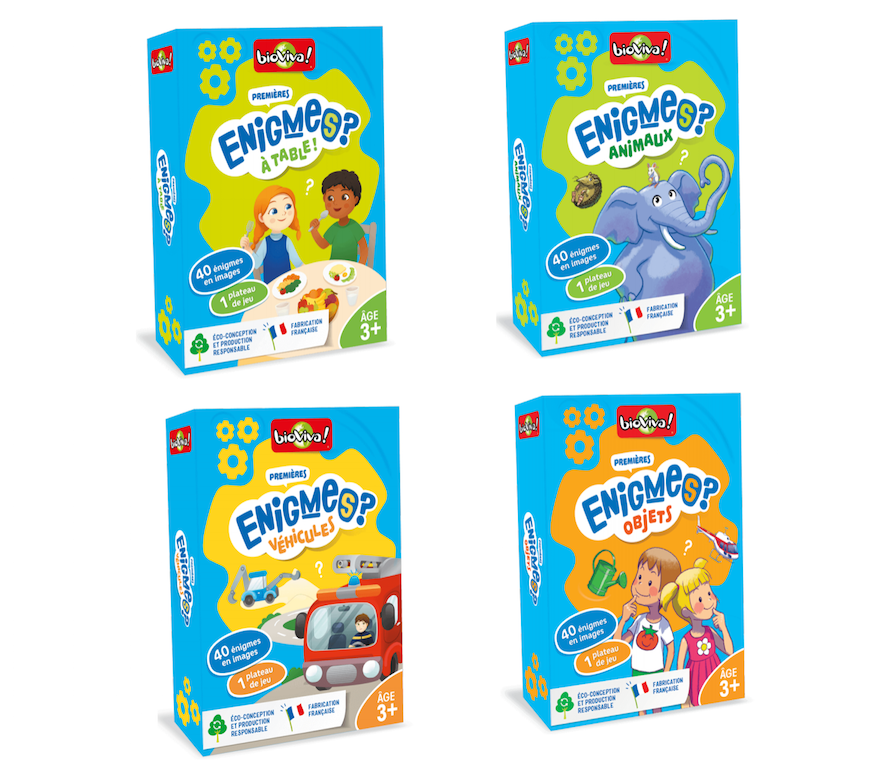 Si les premières Enigmes (animaux, objets, véhicules…) se destinent avant tout aux tout petits de 3 ans, on pourra trouver également pour les plus grands des niveaux supérieurs avec les boites Enigmes (métiers, corps humain, nouvelles technologies, chevaliers et châteaux forts…) destinées plutôt à des enfants à partir de 7 ans et 9 ans.