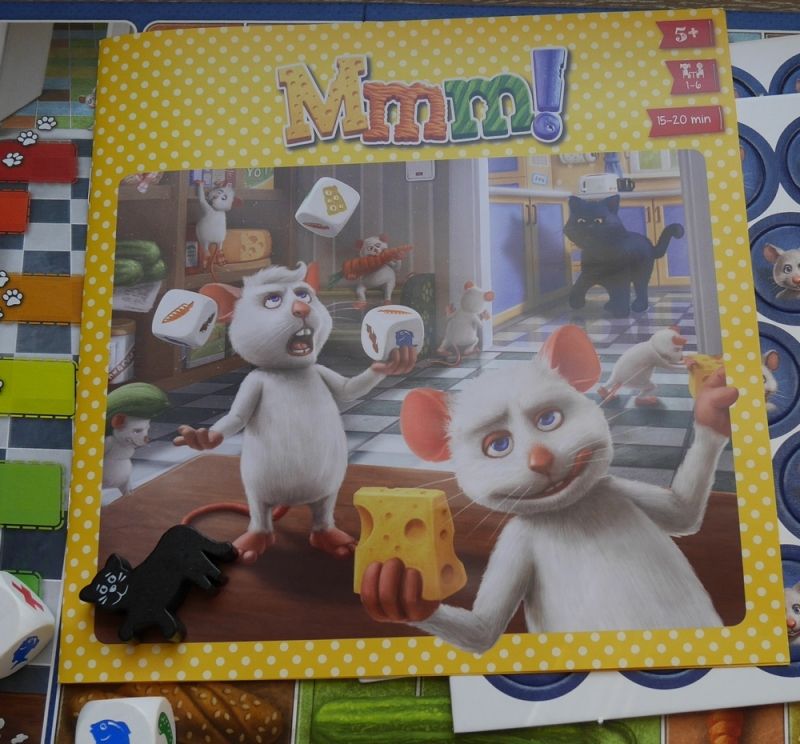 La boite de MMM! on trouve le pion chat noir et 56 pions souris (7 de plus que nécessaire) et 3 dés nourriture.