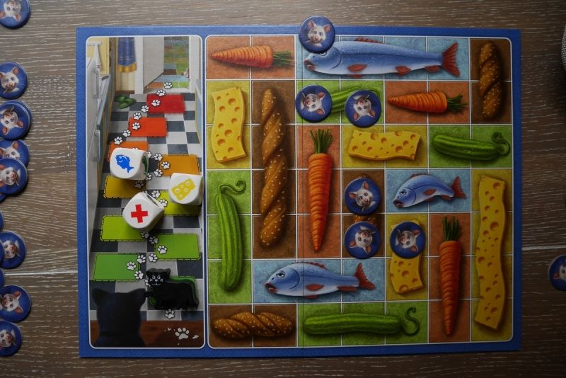 A la fin du tour tous les dés placés sur le plateau sont remplacés par des jetons souris, et on passe au joueur suivant.