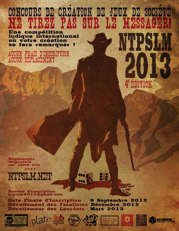 Pour la quatrième fois, Ne tirez pas sur le messager (un blog ludique qu'on apprécie beaucoup) lance un concours de création de jeux de société. Le concours "NTPSLM 2013" vient d'ouvrir ses portes et vous invite à envoyer vos dossiers de candidatures par email dès à présent et jusqu'au 9 septembre 2012.