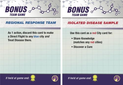 Pour augmenter un peu la durée des parties, beaucoup de cartes « Epidémies » et « Bonus » sont ajoutées au deck « Joueur ». Chaque carte « Bonus » non utilisée à la fin de la partie rapporte 1 point de victoire. Les joueurs doivent donc équilibrer utilisation/garder des cartes (et donc réduire la taille de leur main)