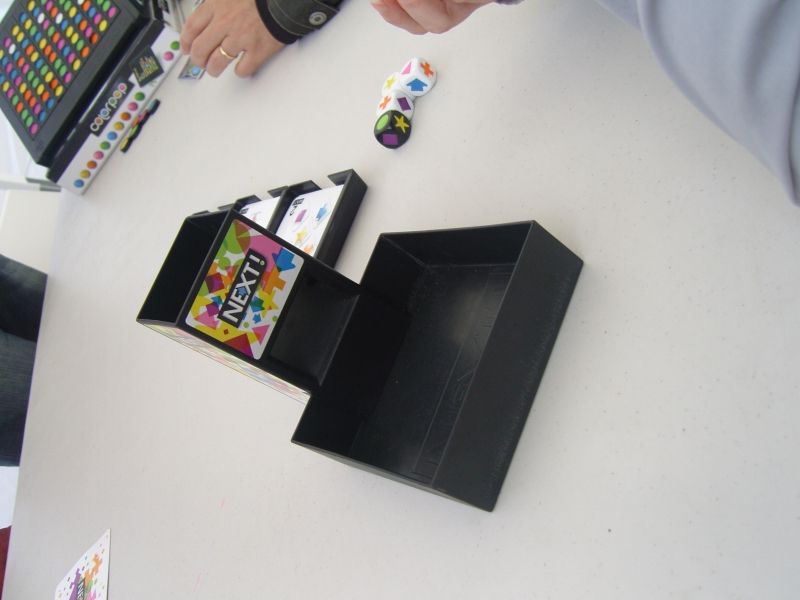 Mais ici, une idée vient s'ajouter : l'arrière de la couverture de la boite fera office de plateau de jeu tandis que l'intérieur de celle-ci aura les compartiments pour les divers jetons à utiliser durant la partie, un peu comme une "banque" ou un "sabot" pour ceux qui comprennent ces termes. D'ailleurs, l'éditeur se servira de la boite dans de futurs jeux de la gamme comme d'un plateau 3D pour le jeu (Cléopatre et la société des architecte ou encore Water Lily avaient utilisé ce principe).