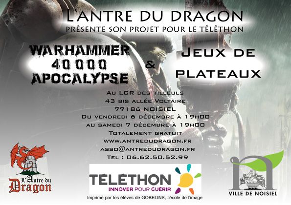 A l'occasion du Téléthon, l'Antre du Dragon, l'association de jeu de la ville de Noisiel, vous invite à venir jouer pendant 24h.