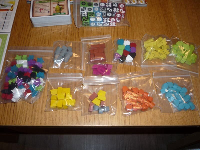 On y trouve la règle du jeu ainsi qu'une aide de jeu, trois "punch board", un paquet de cartes, des dés, une série de pièces en bois pré-triées en partie (ça c'est rare :p) et un plateau de jeu. Une série de pochettes en plastique est aussi fournie pour pouvoir tout ranger dans la boite.
