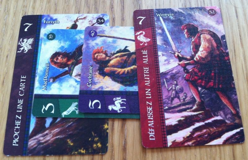 Chaque carte reprend donc sa force, le blason de sa famille et son pouvoir. Un chiffre complémentaire est indiqué en haut à droite et permet juste de régler les égalités en fin de manche.