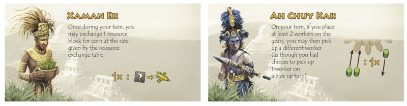Xaman Ek : Une fois par tour, vous pouvez échanger une de vos resources contre du maïs, au taux donné par la ressource dans le tableau d'échange.