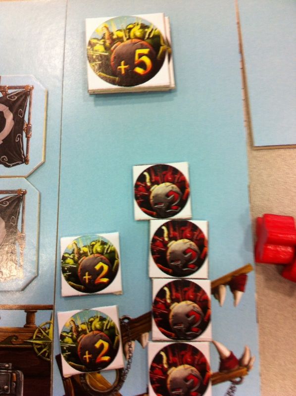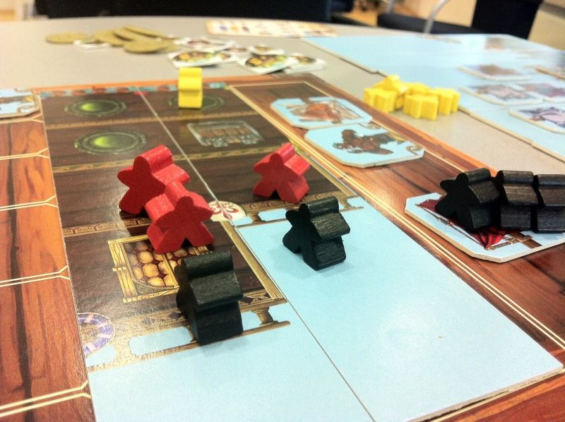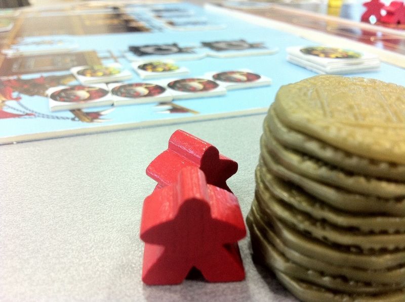Quatrièmement, on partage le butin. Chaque joueur récupère les pièces sur lesquelles il est majoritaire (c'est-à-dire qu'il a placé le plus de meeples dessus, lors du pillage du coffre-fort). Et si c'est égalité ben tant pis, personne ne récupère rien.