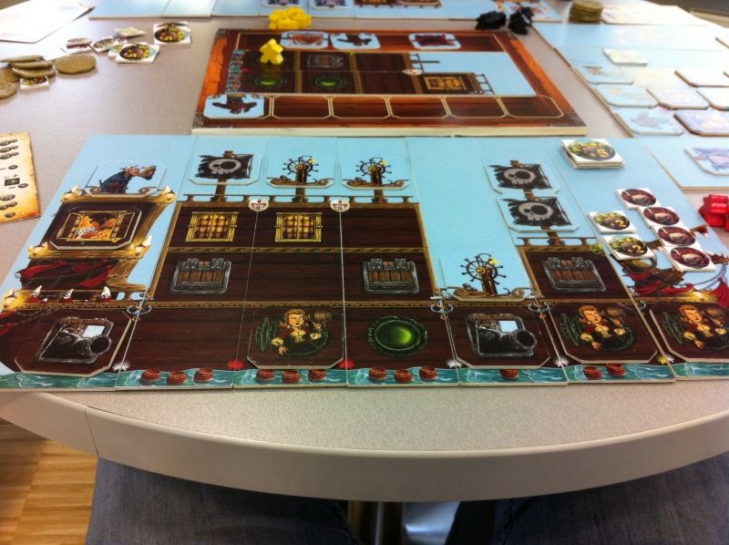 Chaque manche est divisée en six phases. Premierement, il faut approvisionner le trésor. C'est une phase de mise en place en fait. Vous avez à votre disposition un coffre fort, composé de deux plateaux épais, dans lequel vous allez placer les pièces que vous pourrez prendre lors de la manche. Les différentes pièces sont placées face cachées, de telle sorte que vous ne savez pas ce qu'il va y avoir. On y retrouve des morceaux de bateau, des membres d'équipages, des drapeaux, des décorations de fenêtres ou hublo,... Ensuite, vous refermez le coffre fort et vous le retournez.
