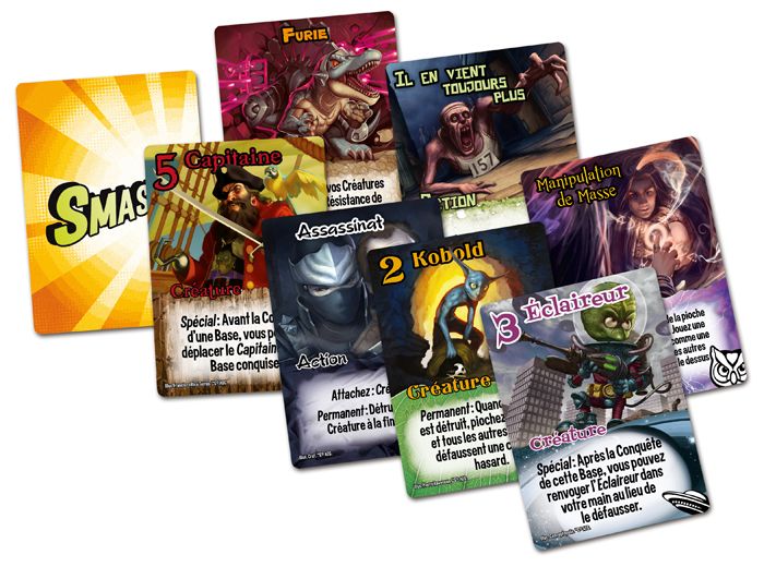 La boite de base de “Smash Up” contient 8 factions, vous pourrez jouer avec les Aliens, les Dinosaures, les Ninjas, les Pirates, les Robots, le Petit Peuple, les Sorciers et les Zombies. Sachant que vous combinez au choix deux factions (par exemple les Aliens Zombies), cela vous fait déjà 28 armées différentes possibles. A cela s'ajoute toute une série d'extension avec des Fantômes, des Plantes Carnivores, des Cultistes, des Voyageurs du Temps, des Vampires, des Chats, des Princesses,...