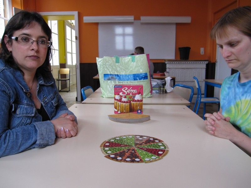 Patricia et Carla attendent le partage de la première tarte multicolore.
