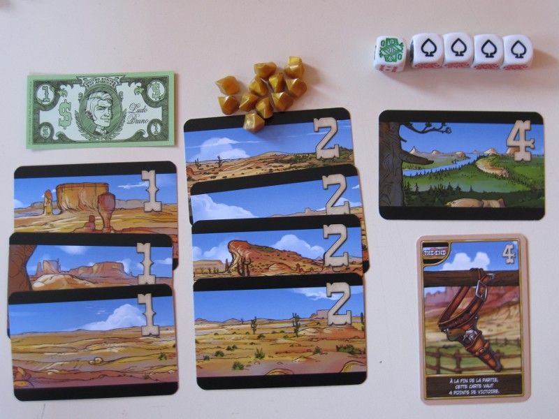 Un plateau coloré, des cartes, des dès, des billets et des pépites.