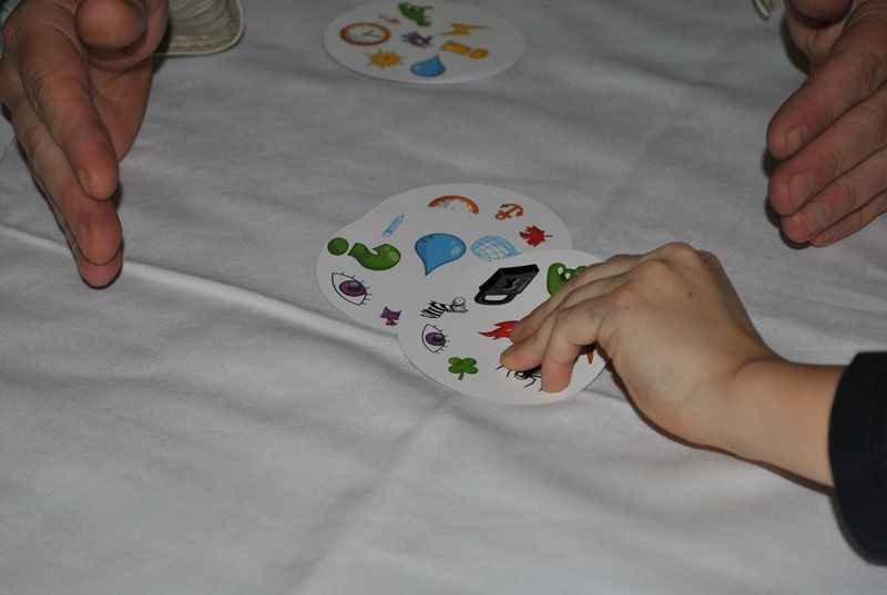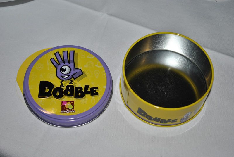 Dobble, un jeu qui séduit toujours autant et en voici la preuve, le matériel n'est plus dedans car utilisé pour une partie.