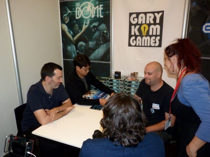Le soir arrive et nous tombons sur nos amis de Ludovox (Shaman et Shanouillette) en pleine interview vidéo Live de Gary Kim et Vincent Dutrait sur le stand de Gary Kim Games.