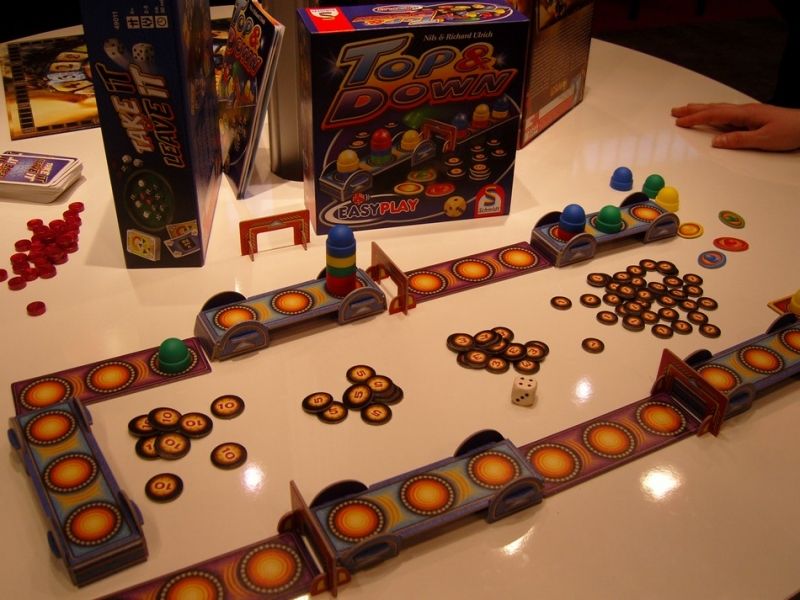 Top & Down est un jeu malin : sur les parties hautes, il faut avoir son pion en haut de la pile pour marquer beaucoup de points, et sur les parties basses, il le faut en bas.