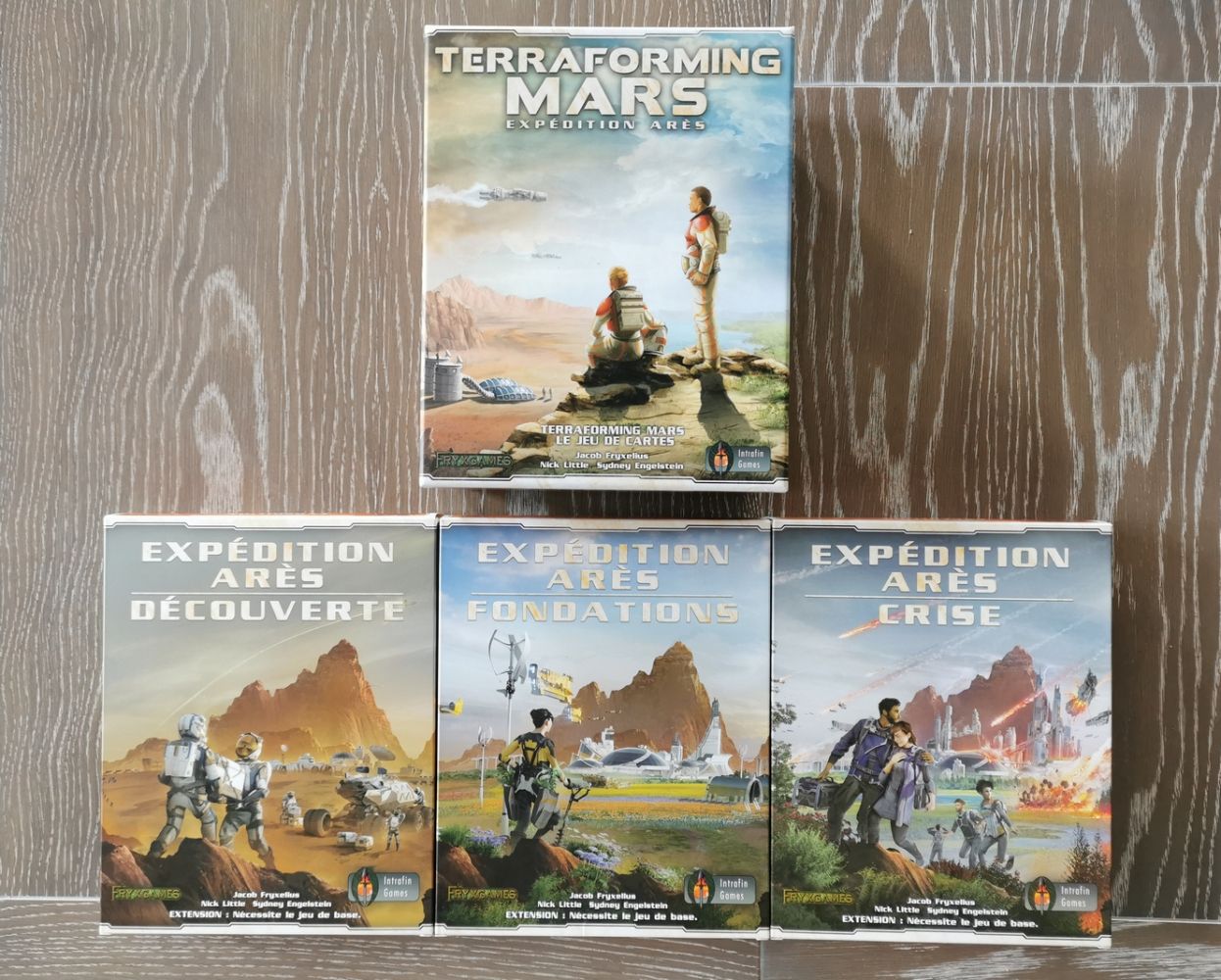 Intrafin est partenaire de Fryxgames depuis le début de l'aventure Terraforming mars. Alors c'est tout logiquement que le Kickstarter des extensions de Expédition Ares sort en VF chez l'éditeur belge. Toutefois les extensions se présentent indépendamment. C’est donc à la carte et c'est à vous de voir quelle extension vous conviendra en fonction de vos goûts ou de vos habitudes de jeu :