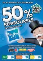 En effet, pour l'achat d'un jeu de société Hasbro (qui regroupe les jeux Parker, MB, Plaskool et "les bons voyages"), en remplissant un bon que vous envoyez par la suite, vous aurez 50% de remboursé.