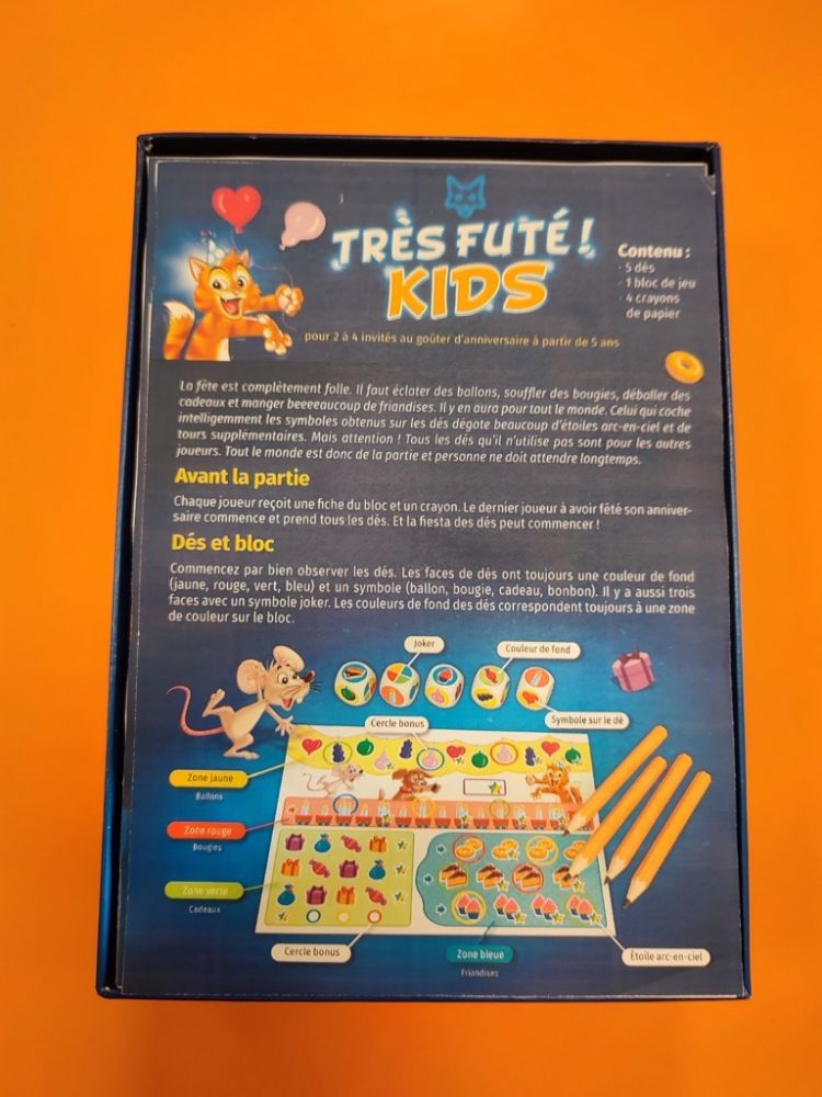 Dans Très futé ! Kids, les petits joueurs à partir de 5 ans devront cocher des symboles obtenus sur des dés (ballons, bougies, friandises...) pour récupérer un maximium d'étoiles.