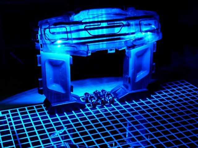 Le plateau s'offre à vous telle la grille dans le film mais l'astuce ultime réside dans la peinture utilisée. Celle-ci réagit aux UV et produit cette couleur bleue typique de Tron. Il faut donc utiliser une lampe aux UV pour en bénéficier. Bronzage des mains assuré!