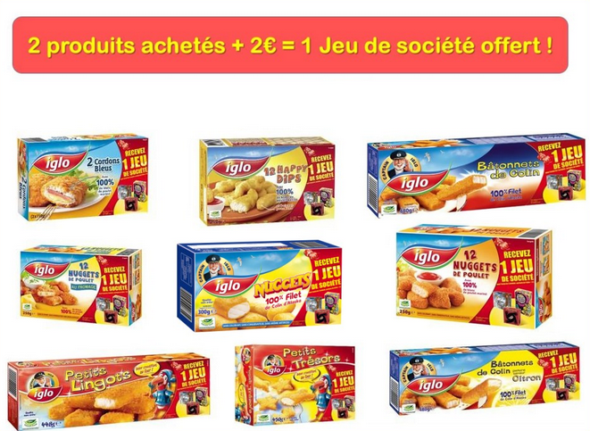 Vous aimez le poisson pané ? Si oui, voici une nouvelle qui va vous inciter à en manger : depuis la rentrée scolaire, vous avez droit à l'offre suivante : pour deux produits Iglo achetés + 2€ = 1 jeu de société vous est offert, au choix, parmi Jungle Speed, Djam et Les loups-Garous de Thiercellieux.