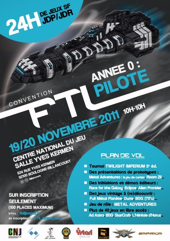 Les 19 et 20 novembre 2011, de samedi 10h à dimanche 10h, se tiendra la convention FTL (Faster than Light), une manifestation consacrée aux jeux de plateau et jeux de rôle à travers le prisme exclusif de la science-fiction.