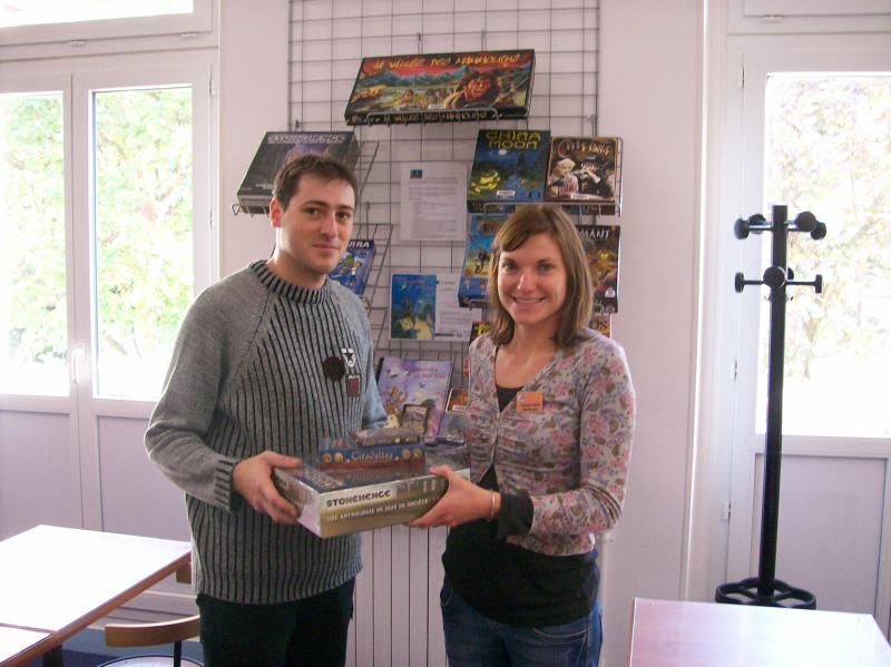 On voit ici l'une des ravissantes personnes y travaillant remettant son lot au vainqueur du concours de Stonehenge, récompensant la meilleure règle de jeu pour le jeu éponyme.