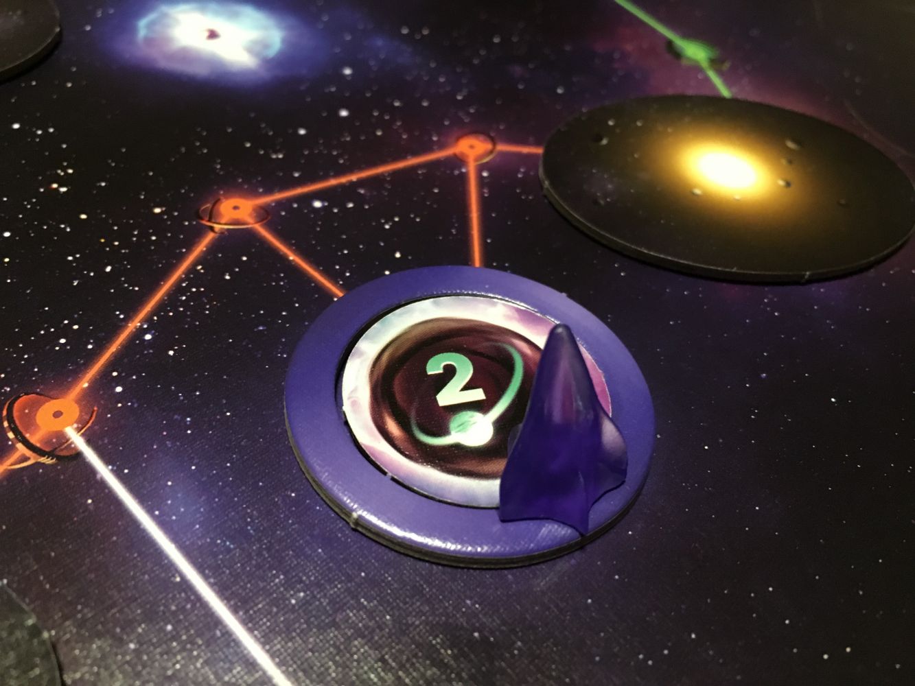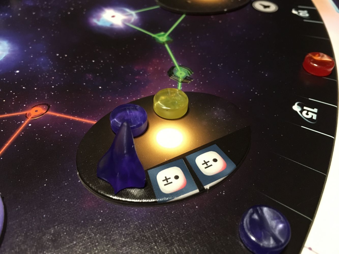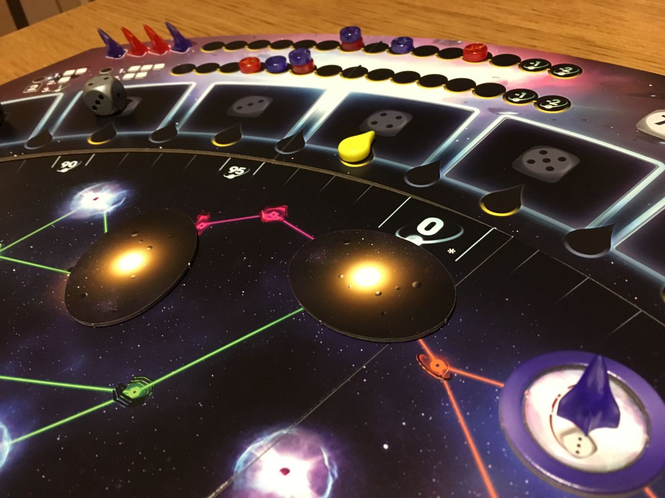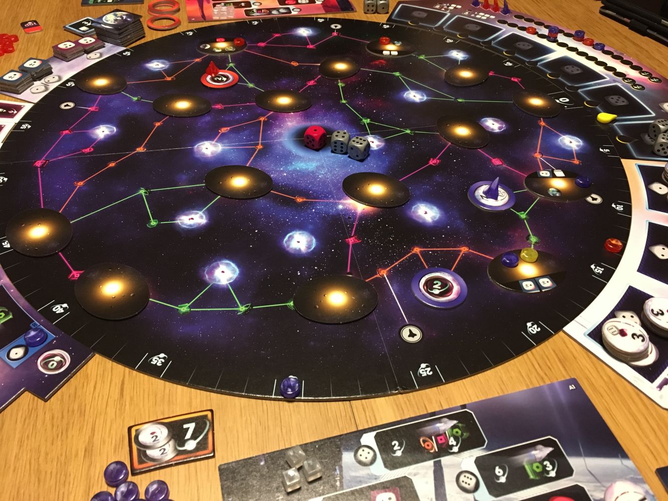 A la fin de la partie, un décompte final est réalisé. Certaines technologies vous rapporteront des points, les trois objectifs de la partie seront scorés, votre position sur la piste d’initiative pourra également vous rapporter des points, en fonction du nombre de planètes que vous aurez colonisé, vous pourrez également gagner des points et les pulsars non aménagés, les cubes d’ingénierie restant et les gyrodines non placées.