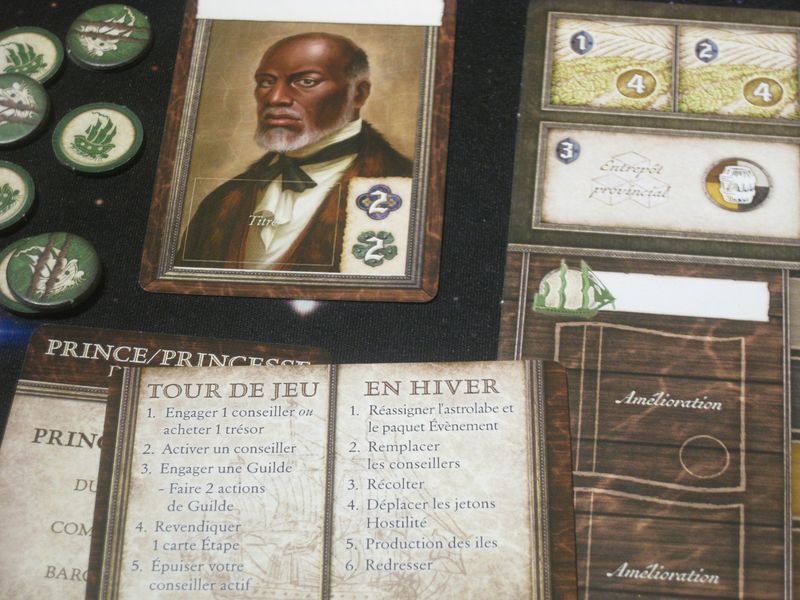 Les joueurs ont aussi un plateau individuel qui détermine l'état de ses propriétés, ses conseillers, et un coffre qui sert notamment à ranger du matériel entre deux parties (mais il faut le sortir pendant le jeu...).