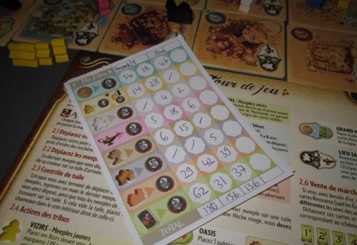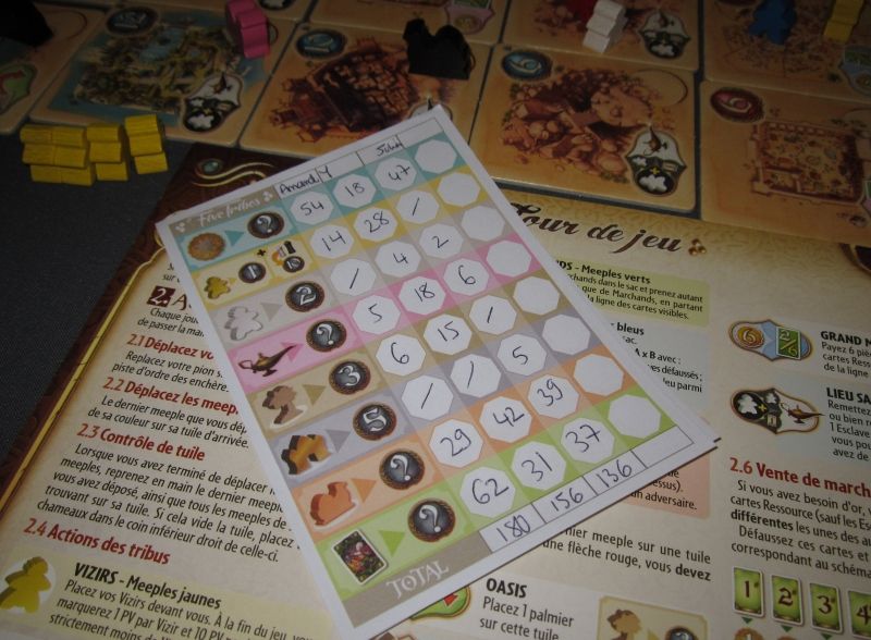 Beaucoup de choix au début, des choix plus restreints vers la fin. Yannick a bâti sa stratégie sur les Djinns et les Vizirs, Julien sur les tuiles et les Djinns, et enfin, moi, sur les marchandises et l'argent.