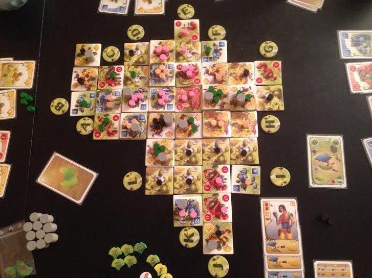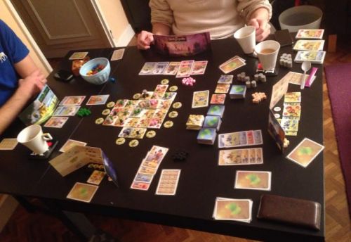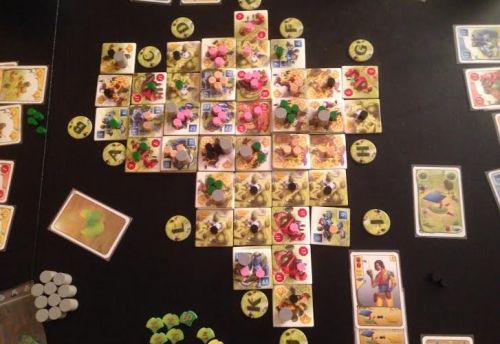 - Jean-Eric a pris beaucoup de positions au 3eme niveau (donc 3 ressources sur chaque tuiles). Il a peu de quartier par contre. Il a récupéré des pouvoir de cartes lui permettant de scorer en fonction du nombre de ressources positionnés sur ces tuiles.