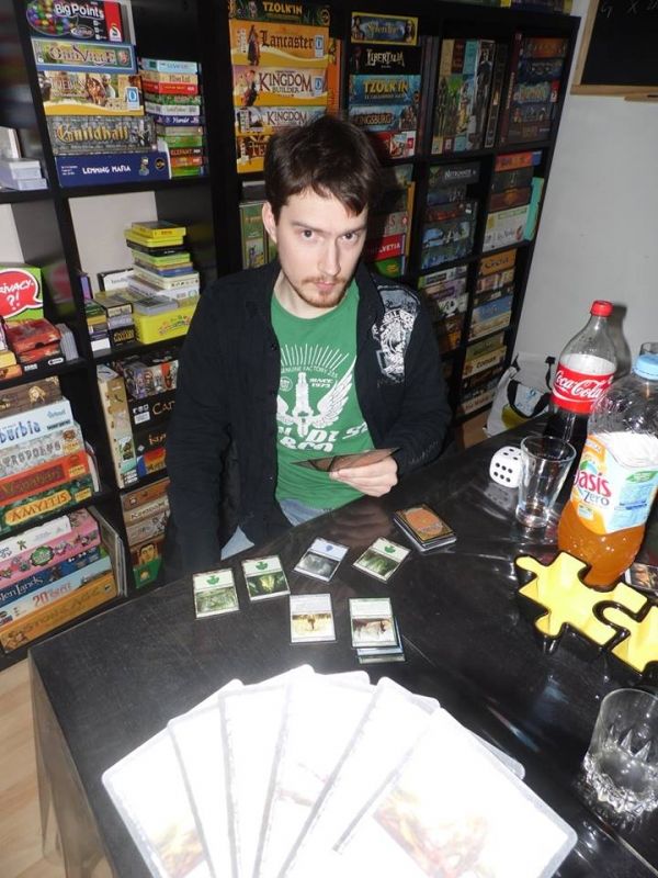 Je me retrouve ensuite face à Cyril, qui a perdu contre Fred. Cyril joue un jeu bleu-vert proche du mien mais avec des créatures volantes et des créatures plus lourdes à poser que moi tout en ayant une jolie courbe de mana. Nous faisons jeu égal durant les trois manches que dure la partie, mais mon jeu combotant davantage fait légèrement la différence. Ma manche perdue est due à un enchantement de créature qui rendait sa cible imblocable. Lors de la dernière manche, cette carte est de nouveau en jeu, mais je gère très bien tout ça. Lors de l'avant dernier tour, j'attaque avec trop de créatures alors qu'une seule, que Cyril ne gérait pas, me suffisait pour l'emporter lors du tour suivant avec cette même créature. Un sort de mon adversaire en renvoit dans ma main et le fait remporter la partie. Je n'aurais pas autant attaquer, j'aurais eu assez de bloqueurs. Trop sûr de moi, j'ai déjouer...