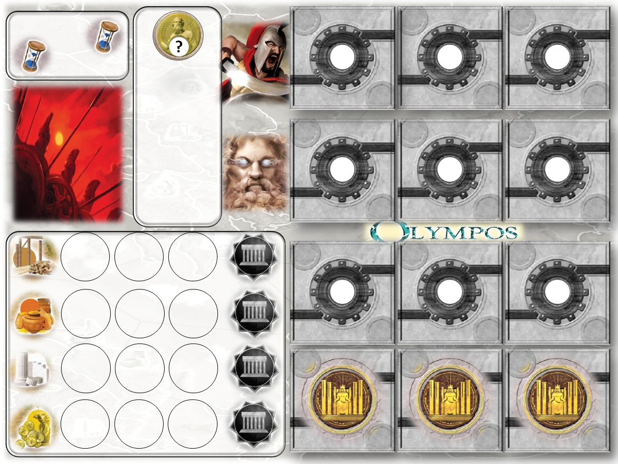 Et ce jeudi, deux parties Olympos avec Stéphane et Laurent qui découvraient le jeu. Voici donc les commentaires de la première de ces deux parties. Une mise en place et explication rapide et nous nous lançons...