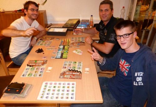 Passé cela, la règle s'assimile très simplement et nous débutons la partie en cherchant nos marques sur quel élément investir. En me saignant sur un bâtiment qui produit des points régulièrement, je remonterai difficilement la pente mais je scorerai pour prendre dès le départ une avance décisive sur mes adversaires.