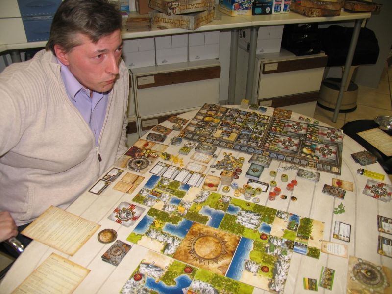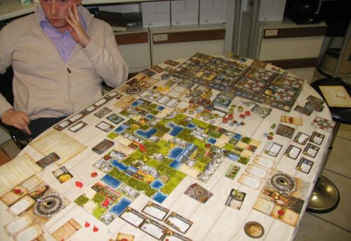 Premiere partie sur un gros jeu apparement mytique civilazation, et je dois dire que j'ai passé une soirée difficile, nous étions trois autour du plateau et le seul a ne pas connaitre le jeu, j'avais juste regardé un tuto sur internet qui expliquait le jeu rapidement, mais rien de plus bref j'écoute les explications du jeu qui sont logique mais misent bout à bout sont trés nombreuses et exigente, bref j'attaque le jeu avec les russes qui il parait sont trés trés bien, mon adversaire Patrick tire les romains et enfin le troisième comparasse j'ai completement oublié sa civilization, bref, le début du jeu est plutot equilibré, et plutot agréable, je prend meme une carte technologie à un de mes adversaires grace au pouvoir des ruses qui copient la technologie des autres joueurs mais en contrepartie je perd une armée, a priori c'est un grand pouvoir. je trouve ca trop dangereux pour la sécurité de ma civilization et j'oubli vite cette capacité grosse erreur, je décide de me militarisé et de me battre de ce coté la, malheureusement il est très difficile de gagner le jeu uniquement grace à la guerre, je prend donc beaucoup de retard sur le plan technologique, et surtout voyant qu'un des deux joueurs prend de l'avance sur tous les plans je m'allie de fait avec Pat, je m'essaye au combat, en tenant de prendre une cité a mon adversaire de droite un coup dans l'eau et je suis nue comme un vers ayant pris du retard dans tout, je subis la partie jusqu'a la fin et je peux dire que je fus noyé par la quantité de règle. En definitif, c'est Patrick qui gagne le jeu de peu grace a l'echelle culturel ce qui est parait t-il très difficile Bravo PAT
