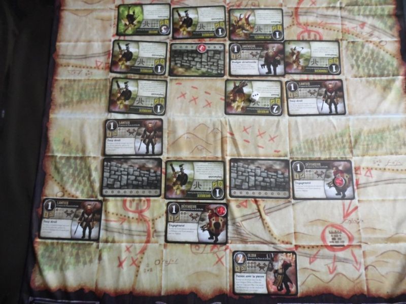 Par dépits et pour le fun, il lance un dé, qui donne un 6, histoire de le narguer davantage. Il ne peut ajouter de troupe car je venais de lui détruire son seul mur, qu'il a remplacé aussitôt (mais comme on joue un mur après avoir invoquer des troupes, il a perdu un tour de renforts...). Arrive mon tour, et un de mes lanciers et mon champion tuent ses deux dernières troupes, tandis que mon petit défenseur achève son boss : la vermine est éradiquée : il ne reste plus un gobelin en jeu !